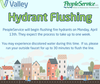PeopleService will begin flushing fire hydrants starting Monday, April 13th. They expect the process to take up to one week. You may experience discolored water for a short period of time. Simply run your outside faucet for up to 30 minutes to flush the line.