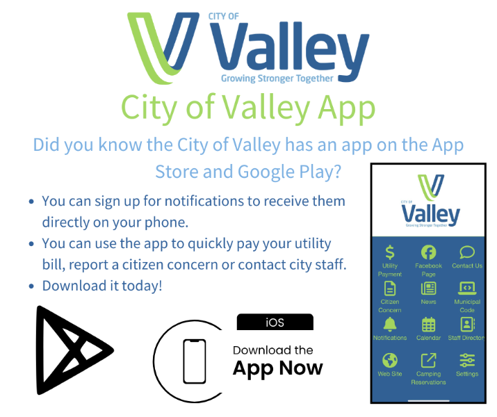 If you haven't already, don't forget to download the City of Valley app! Pay your utility bill, see our Facebook page, report citizen concerns, and more. Download for iPhone or Android.