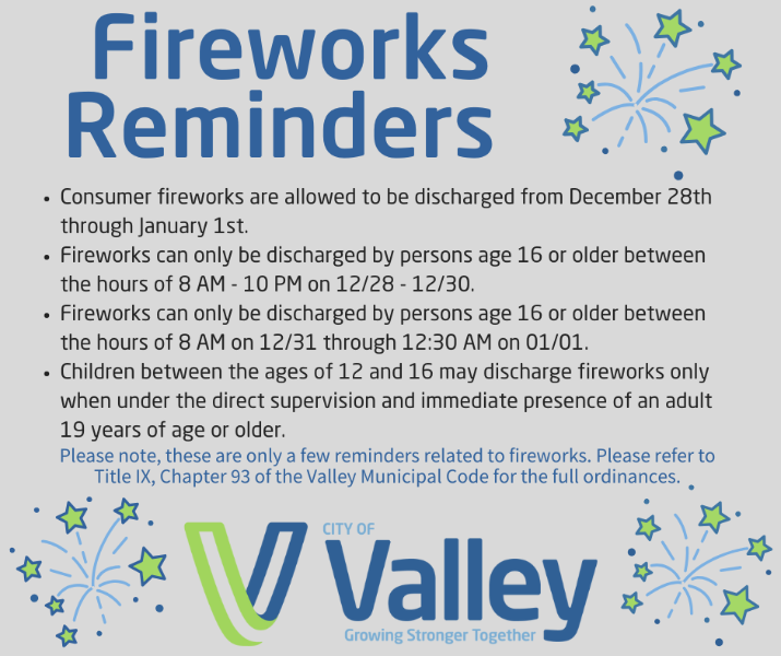 Please note, these are only a few reminders related to fireworks. Please refer to Title IX, Chapter 93 of the Valley Municipal Code for the full ordinances.