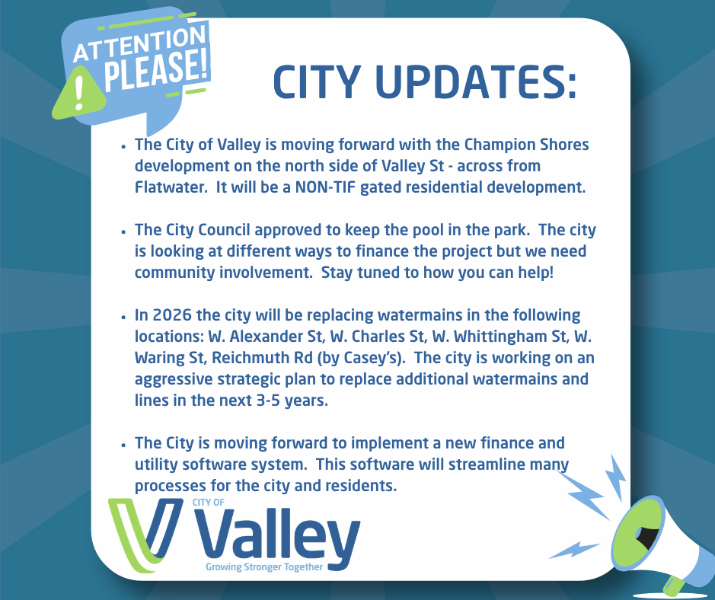 - The City of Valley is moving forward with the Champion Shores development on the north side of Valley St - across from Flatwater. It will be a NON-TIF gated residential development.