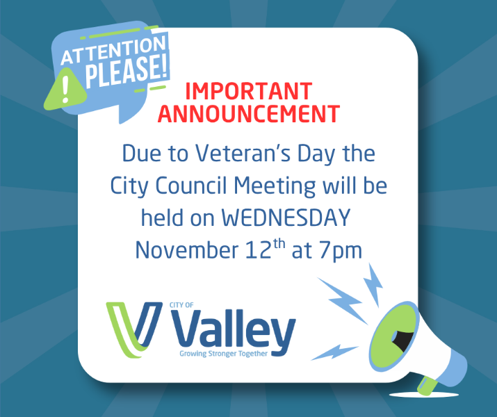 Due to Veteran’s Day the City Council Meeting will be held on WEDNESDAY November 12th at 7pm.