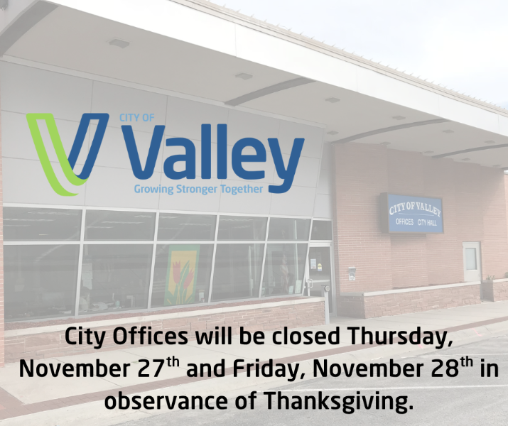 City Offices will be closed all day Thursday 11/27/2025 and all day Friday 11/28/2025 in observance of Thanksgiving. Have a safe and happy holiday!
